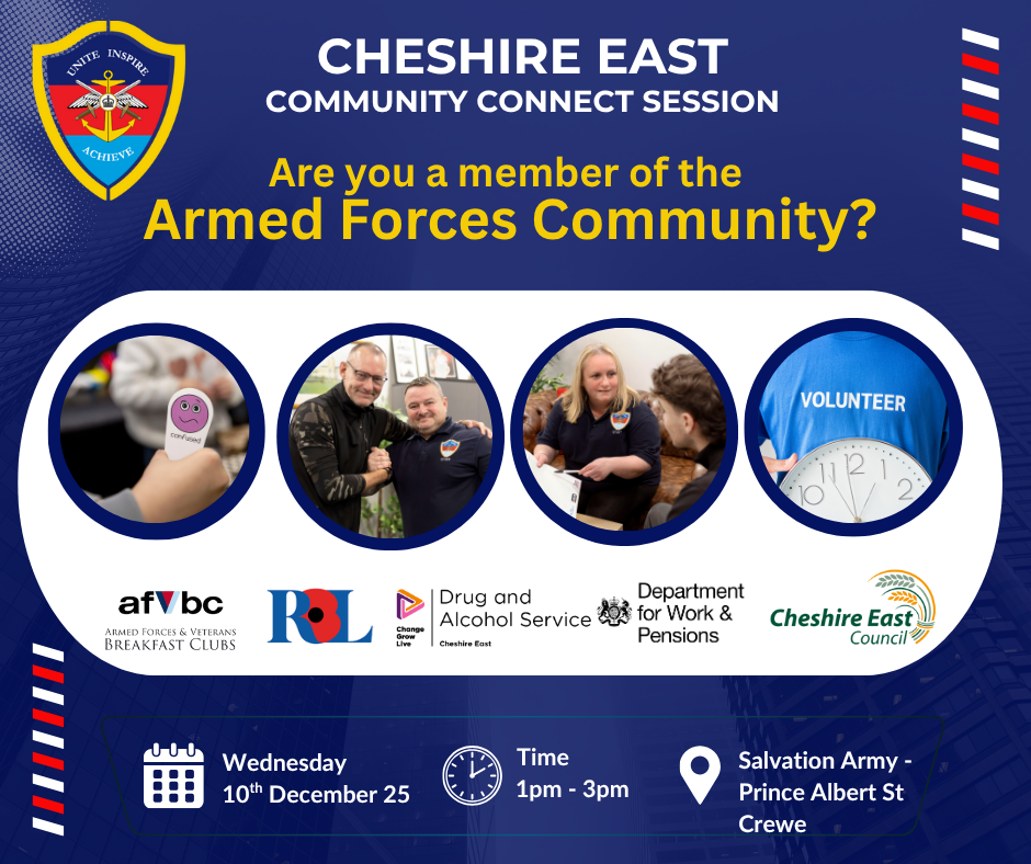 Cheshire East Community Connect Session – Armed Forces – 10/12/25 Posted by: Lisa - Posted on: 1st December 20251st December 2025